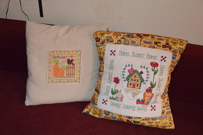 Adesso vi saluto mostrandovi i cuscini del mio divano quello country l'ho ricamato io ai tempi universitari (la mia cara amica Lally se lo ricorderà di certo), mentre l'altro me l'ha regalato la cara Anna.